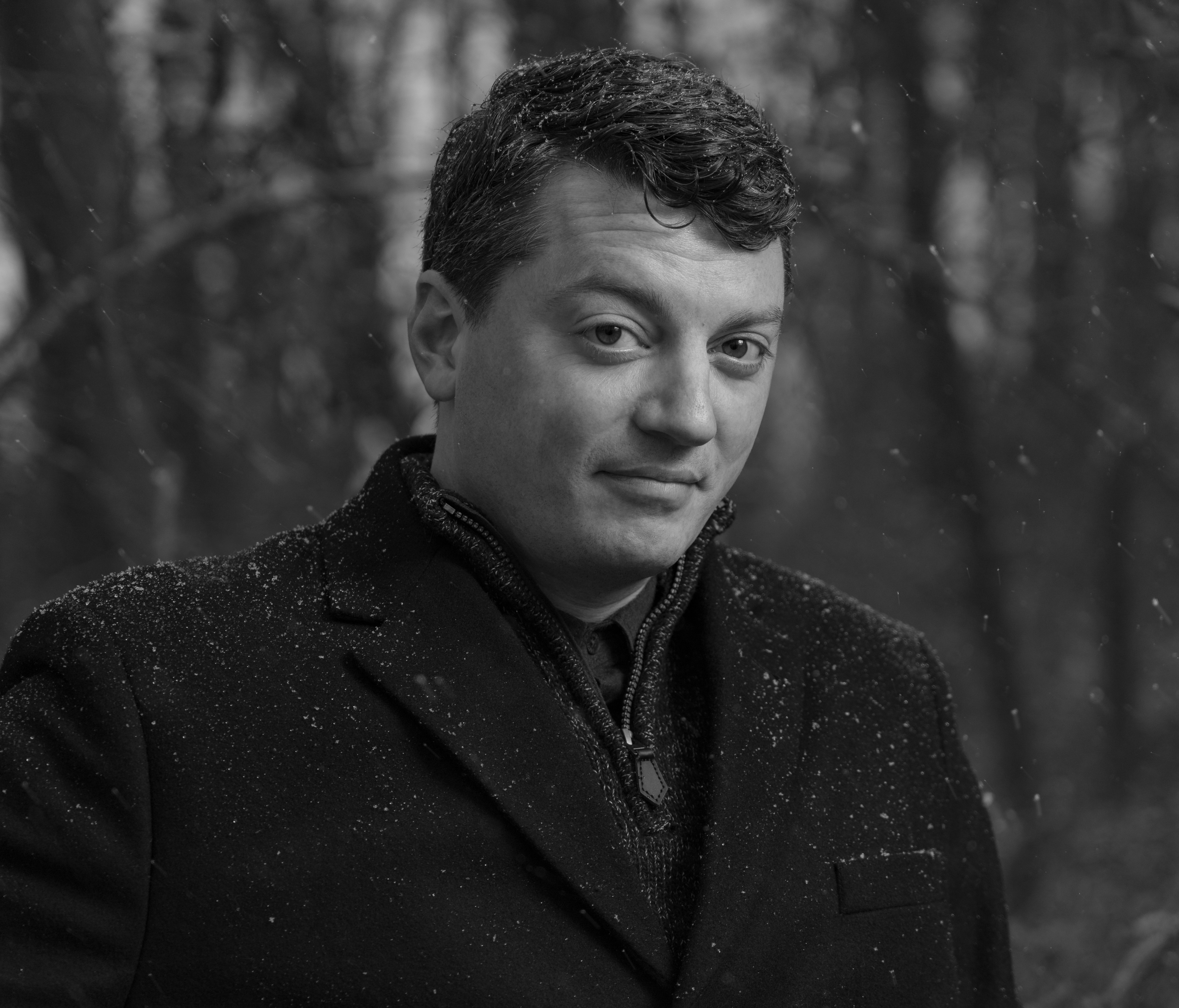 This is a couples portrait during snowfall. Two speedlights and an umbrella were used as key light and backlight. Black attire was chosen to contrast with the snow.