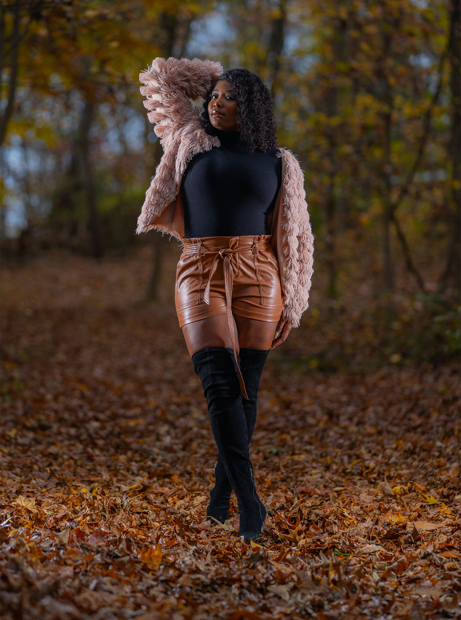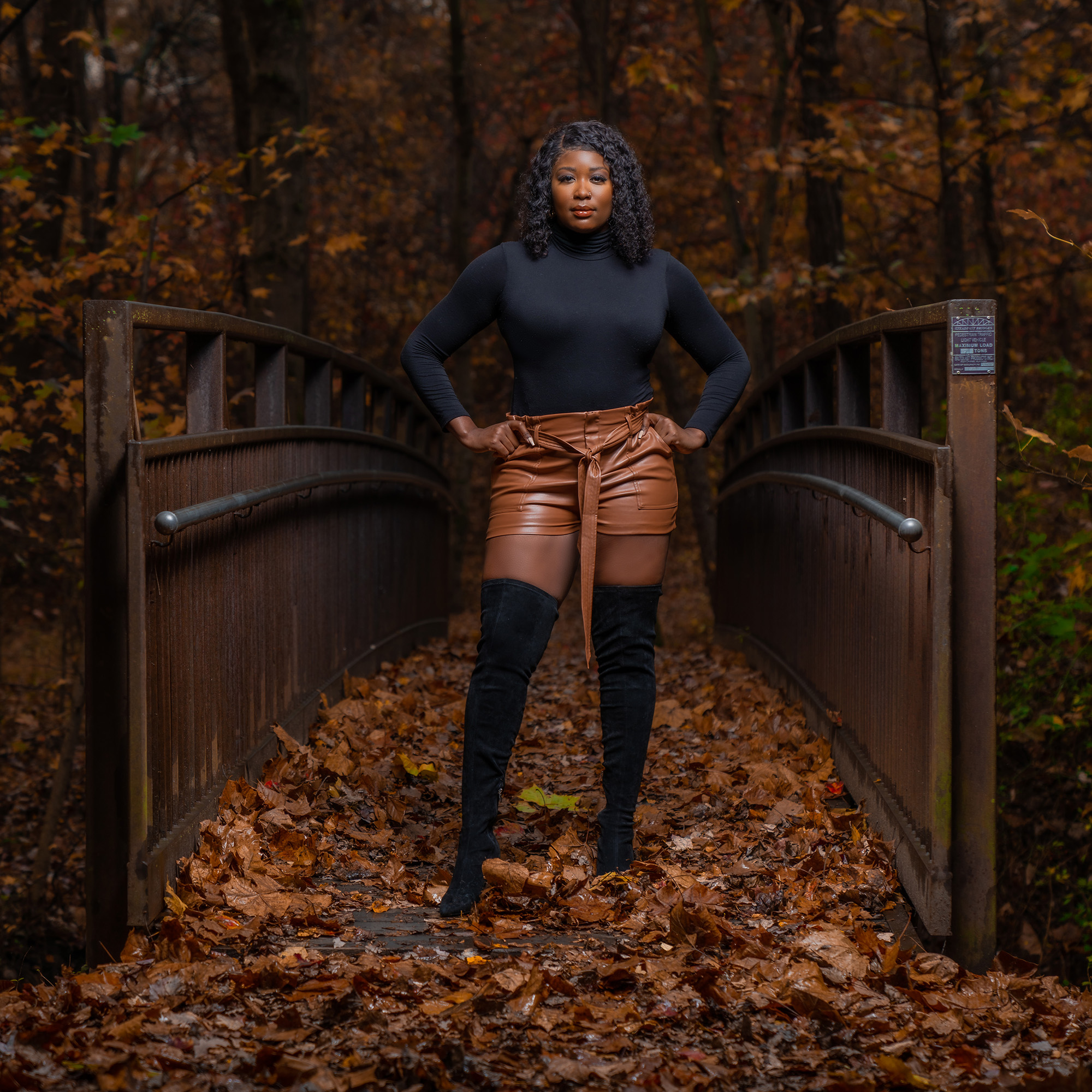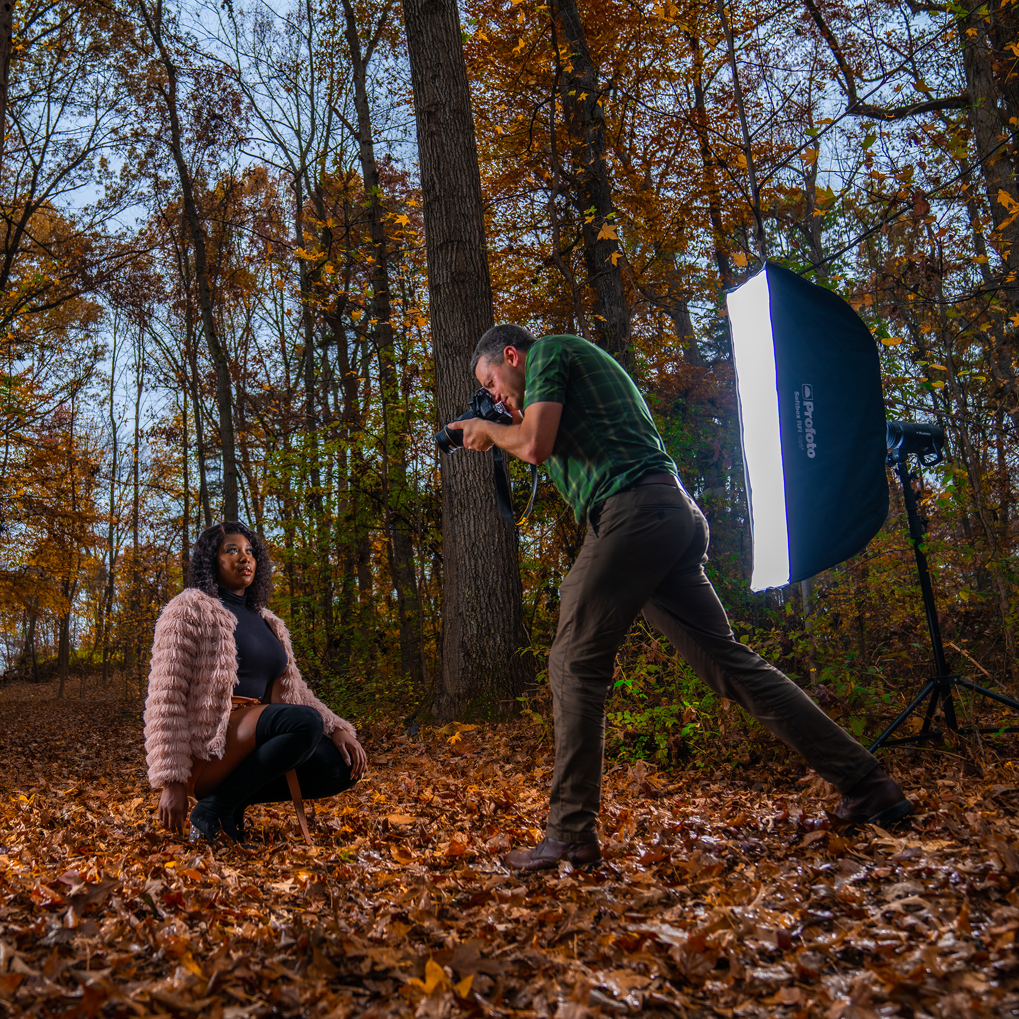 Seasonal portrait at Fort Meade, Maryland. Two Profoto strobes were used with a 4’x4’ and 4’x1’ softbox. Brown and black attire was chosen to compliment the fall folliage.